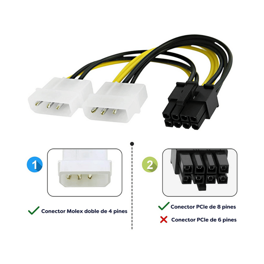Convierte dos conectores Molex en un PCIe 8 pines para alimentar tarjetas gráficas sin cambiar la fuente de poder.