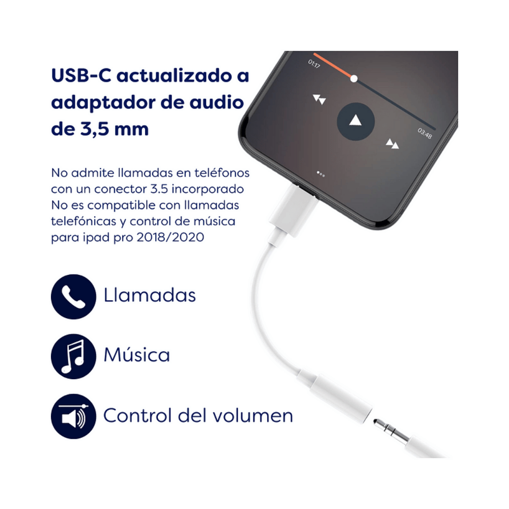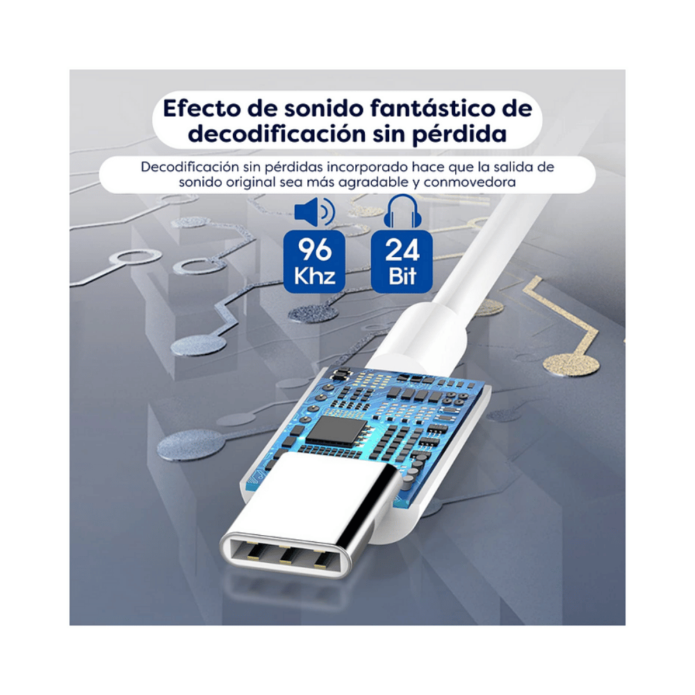 Adaptador de audio diseñado para conectar auriculares con conector 3.5 mm a dispositivos con puerto USB Tipo C. Ofrece sonido estable, compatibilidad amplia y funciones de control integradas para una experiencia auditiva completa.