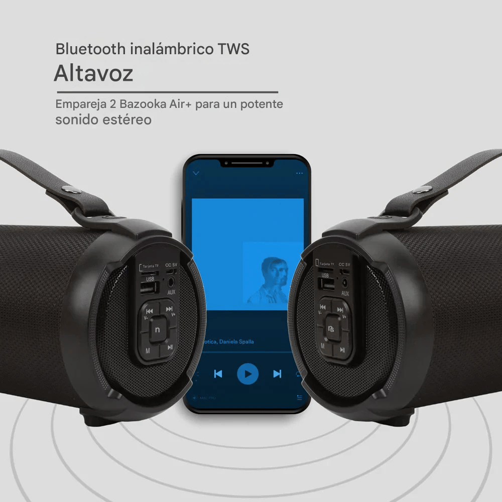 La función True Wireless Stereo (TWS) permite conectar dos altavoces Bazooka Air+ simultáneamente.