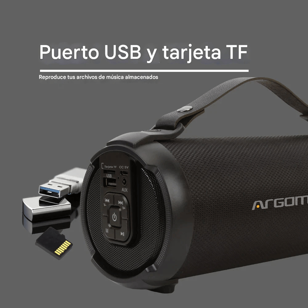 Además de Bluetooth, el altavoz permite reproducir música mediante USB, tarjeta TF y entrada auxiliar de 3.5 mm.