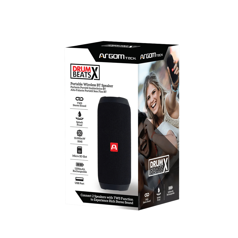 Disfruta de un audio potente y portátil con el altavoz inalámbrico DrumBeats X, equipado con 10W de potencia, tecnología TWS y múltiples opciones de reproducción, ideal para música en cualquier lugar.
