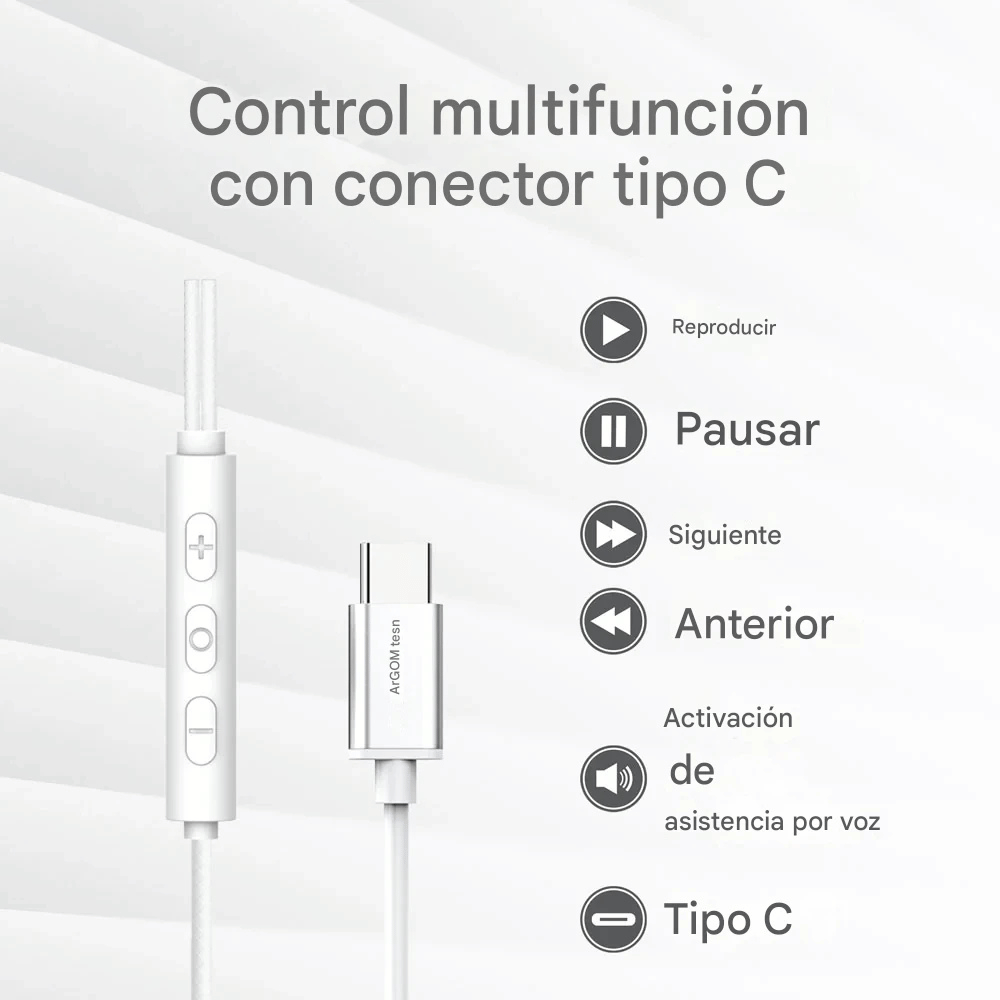 Disfruta de una experiencia de audio superior con los auriculares Argom Aura USB-C, diseñados con carcasa metálica, micrófono integrado y graves dinámicos, ideales para música, llamadas y uso diario.