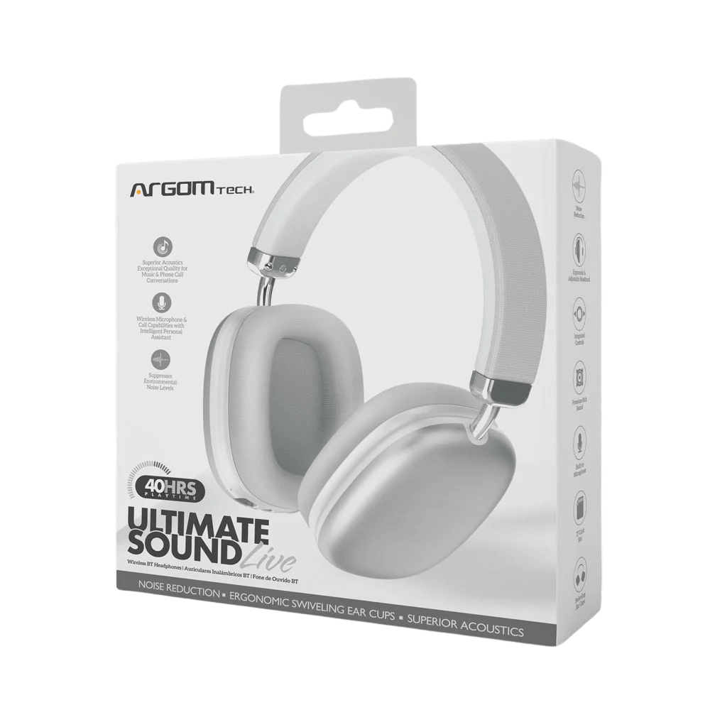 Disfruta de un audio potente y envolvente con los Argom Ultimate Sound Live, auriculares Bluetooth diseñados con reducción de ruido, graves profundos y hasta 40 horas de reproducción, ideales para música, llamadas y entretenimiento.