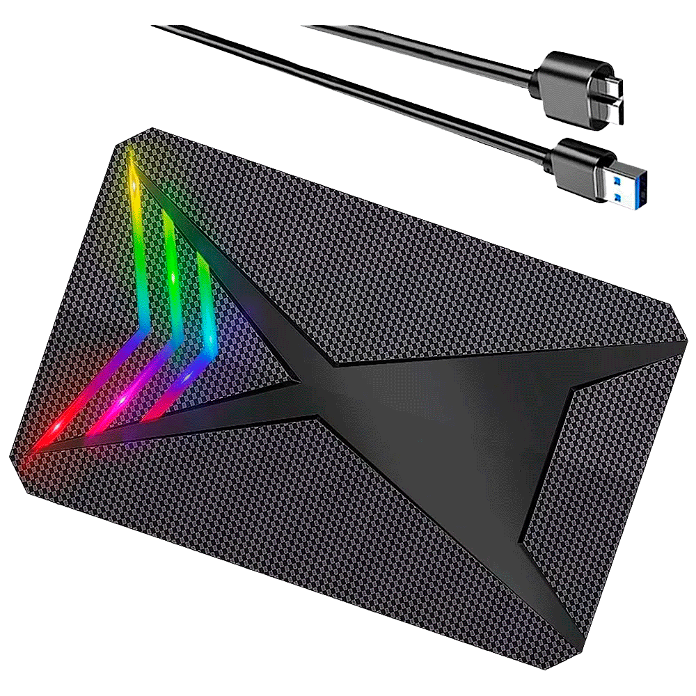 Convierte tu disco duro en almacenamiento portátil con esta caja externa gamer SATA a USB 3.0, diseñada para discos de 2.5 pulgadas, con velocidad de transferencia de hasta 5Gbps, iluminación RGB y compatibilidad con múltiples sistemas y consolas.