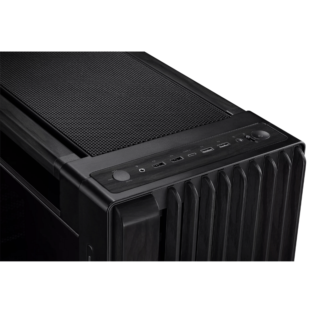Panel frontal y detalles en madera de fresno real, trabajada en un proceso premium de seis etapas para máxima durabilidad y estética. Cada unidad tiene vetas únicas, lo que convierte tu PC en una pieza exclusiva y sostenible.