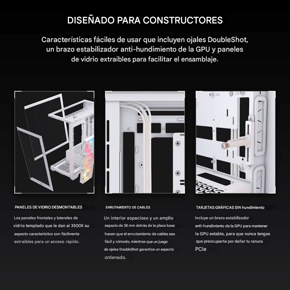 Cuenta con 38 mm para enrutamiento de cables, pasacables de doble capa y brazo de estabilización anticaída para la GPU, protegiendo la ranura PCIe y facilitando un montaje seguro y profesional.