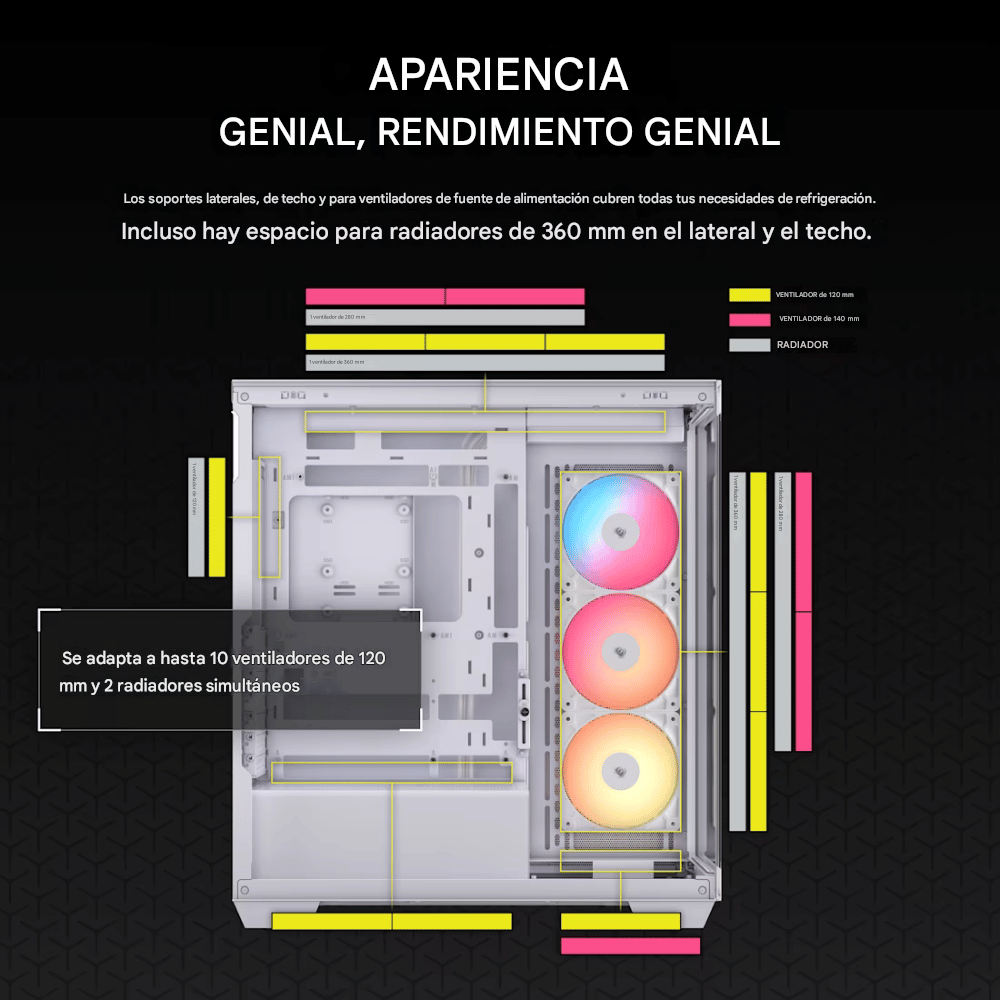 Ofrece amplia flexibilidad térmica con espacio para hasta 10 ventiladores de 120 mm y radiadores de hasta 360 mm en el lateral y el techo, ideal para configuraciones de alto rendimiento y overclocking.
