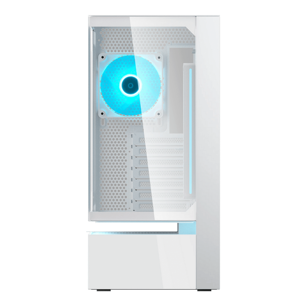 Incluye ventiladores Unity ARGB 240 de aspas invertidas en el lateral y barra ARGB magnética que ilumina la cámara flotante, logrando un efecto visual único con control a través de la placa base o del hub integrado.