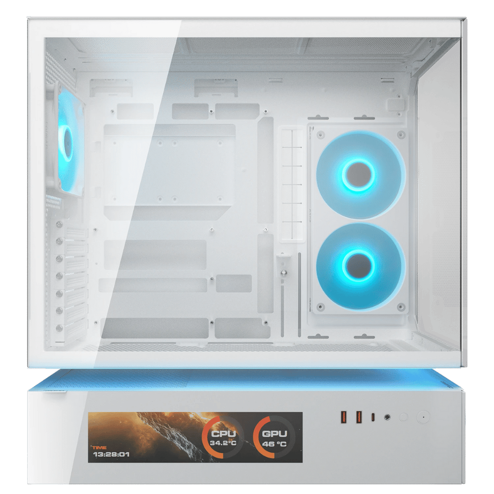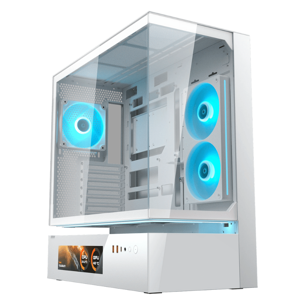Gabinete premium con sistema CFV de enfriamiento arquitectónico, panel LCD para monitoreo en tiempo real y soporte para GPU de hasta 430 mm, diseñado para la nueva generación de hardware de alto rendimiento.