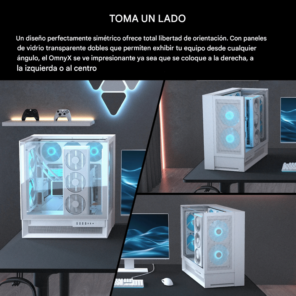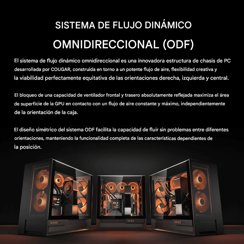 Su arquitectura está diseñada para maximizar la ventilación en cualquier orientación del chasis: izquierda, derecha o centro. El flujo de aire impacta directamente en la GPU desde todos los ángulos, logrando una mejora térmica promedio del 8 % frente a gabinetes tradicionales.