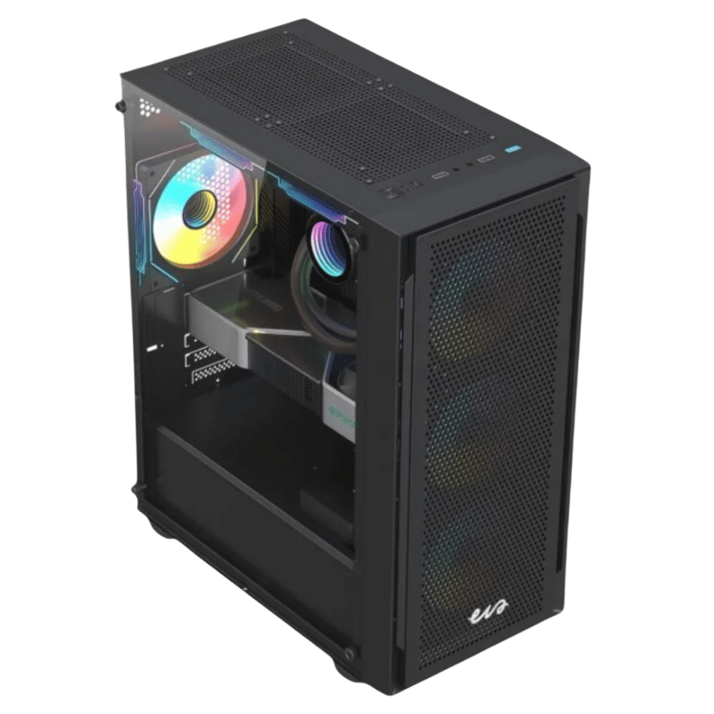Lleva tu setup al siguiente nivel con el chasis gamer EVA Aero X3, equipado con 6 ventiladores ARGB, amplio espacio interno y panel lateral de vidrio. Ideal para configuraciones de alto rendimiento.