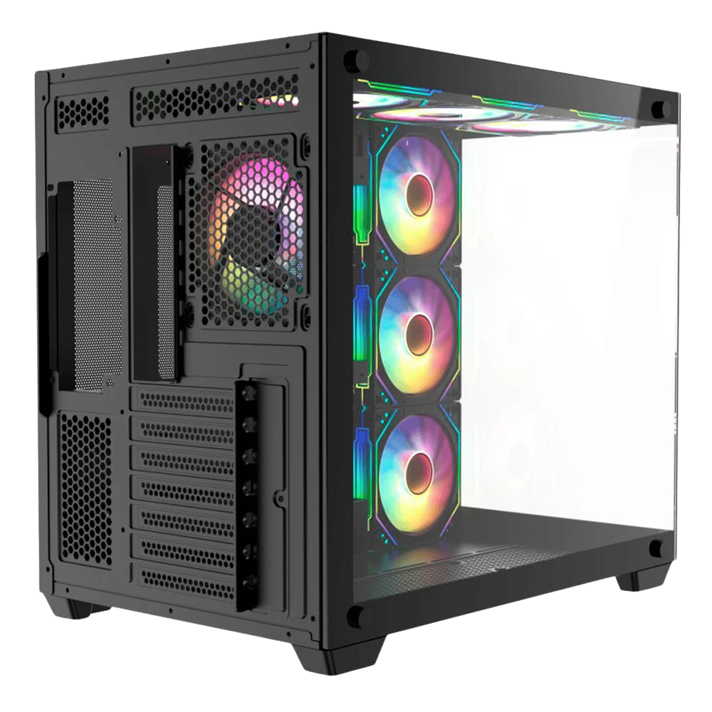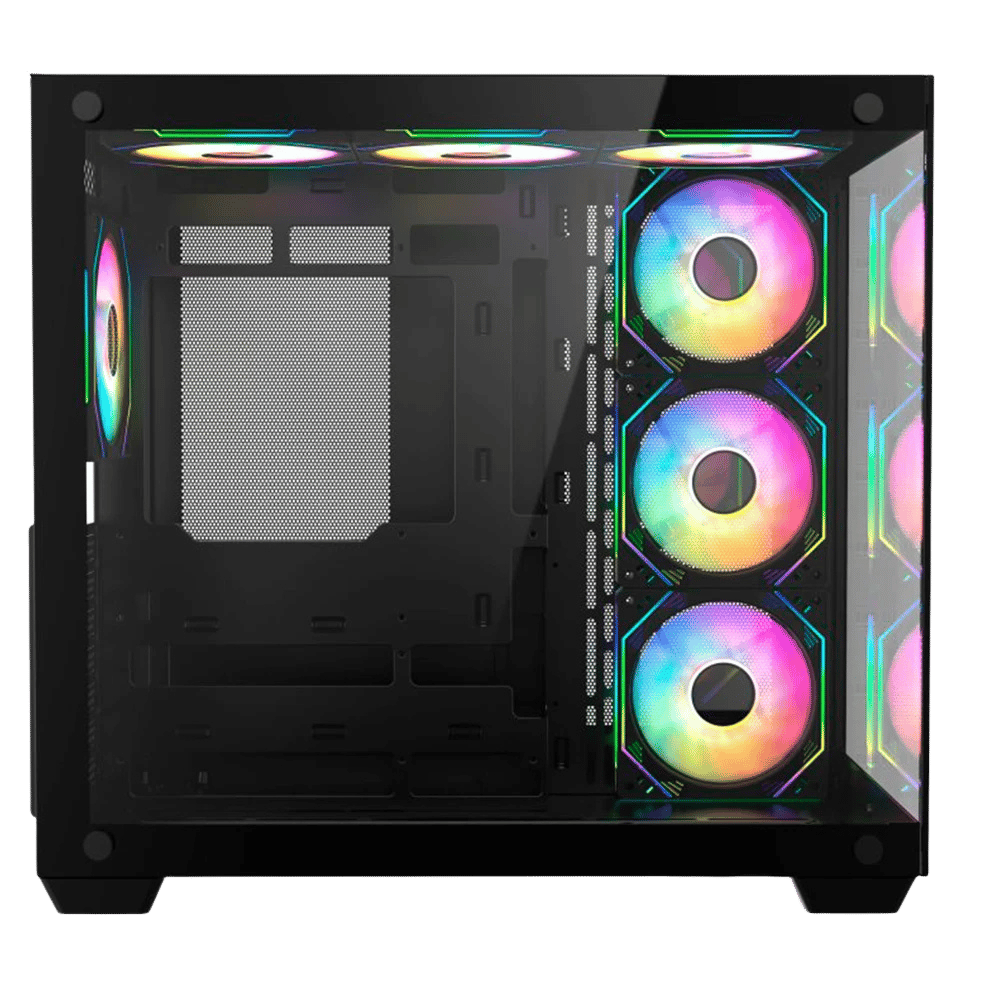 Incluye 6 ventiladores de 120mm con efecto ARGB doble anillo tipo infinity, ofreciendo una estética visual impactante y un flujo de aire constante para mantener tu equipo fresco.