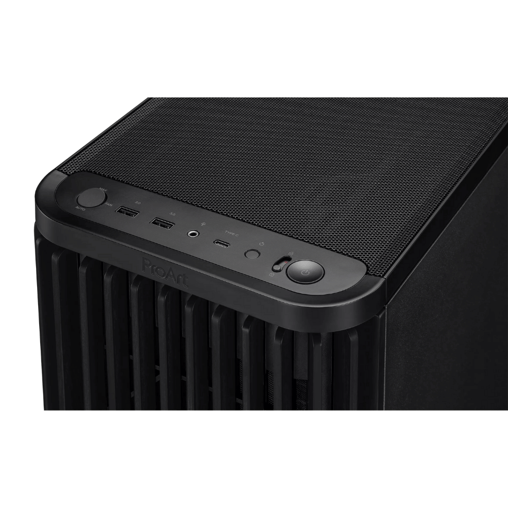 El ASUS ProArt PA401 Wood Edition destaca por su panel frontal de madera de fresno certificada FSC®, tratada en un proceso artesanal de seis etapas que garantiza durabilidad, resistencia y un acabado único. El panel lateral de vidrio templado permite exhibir el hardware con una estética profesional y sofisticada.