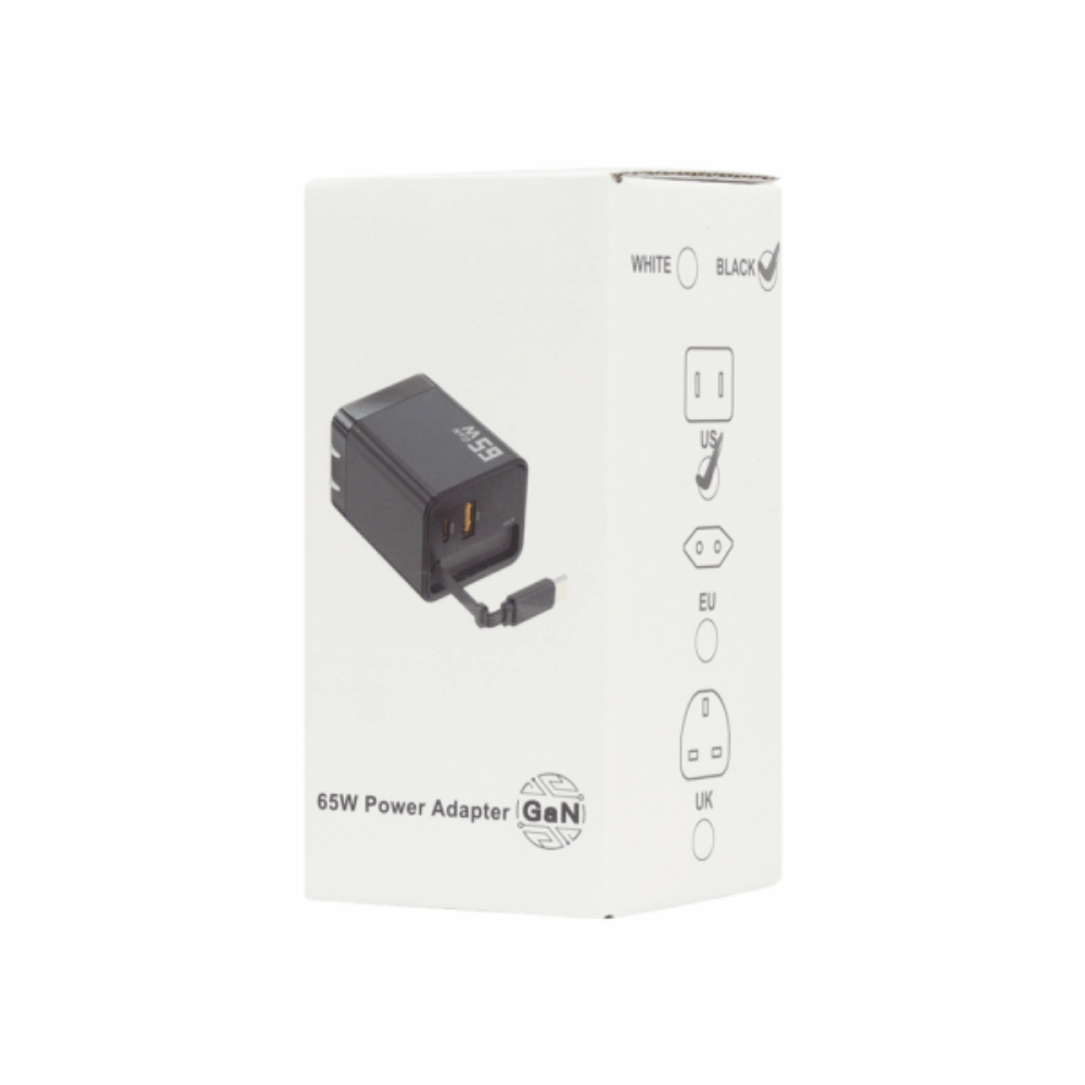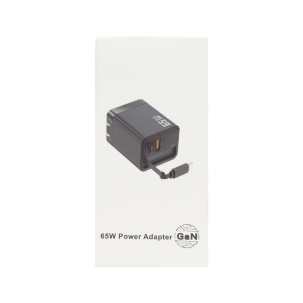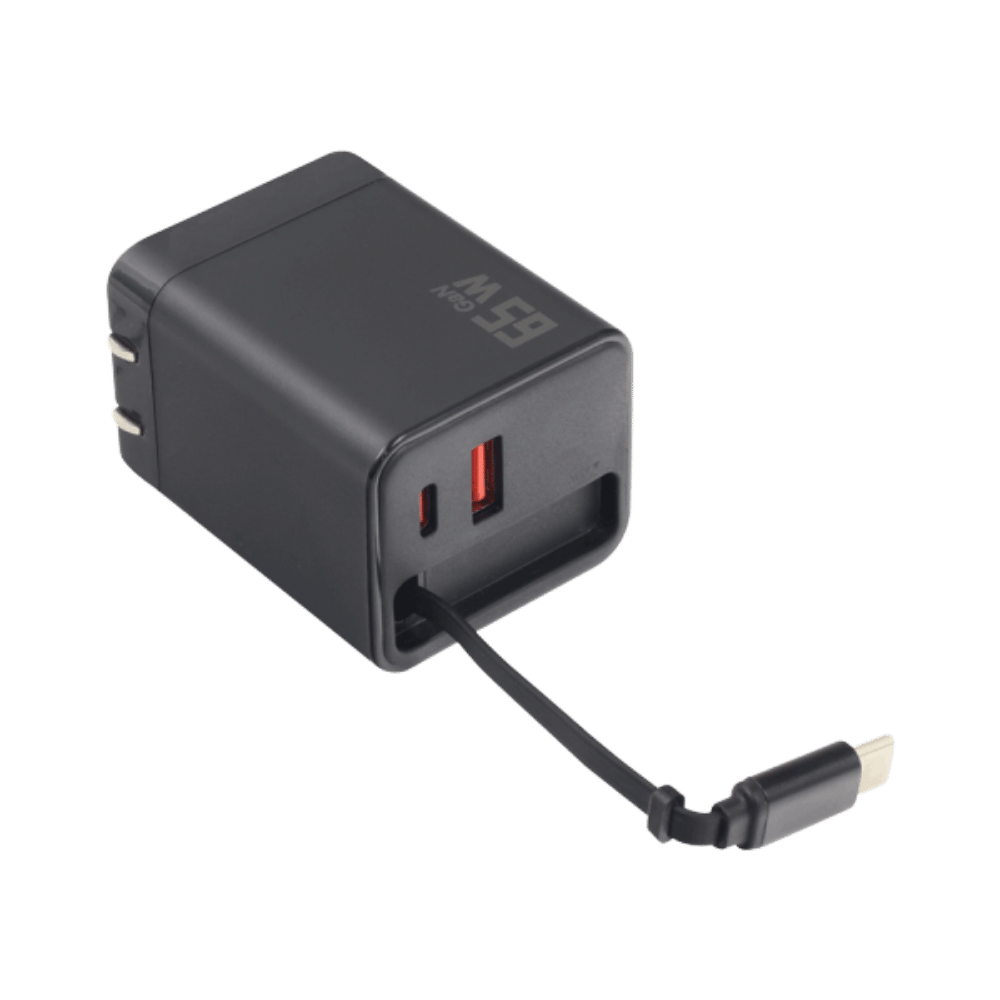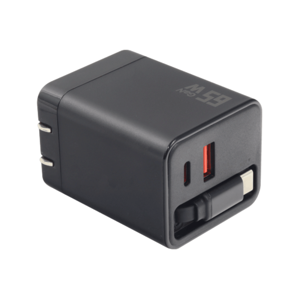 CARGADOR GAN 65W RETRÁCTIL CON USB C Y USB A PARA CARGA RÁPIDA