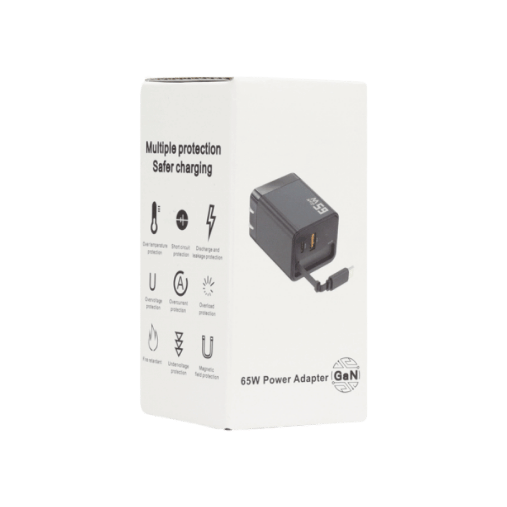 Carga múltiples dispositivos con este convertidor GaN de 65W con cable retráctil, equipado con puertos USB Tipo C y USB Tipo A, ideal para smartphones, tablets, portátiles y otros equipos que requieren carga rápida y eficiente.