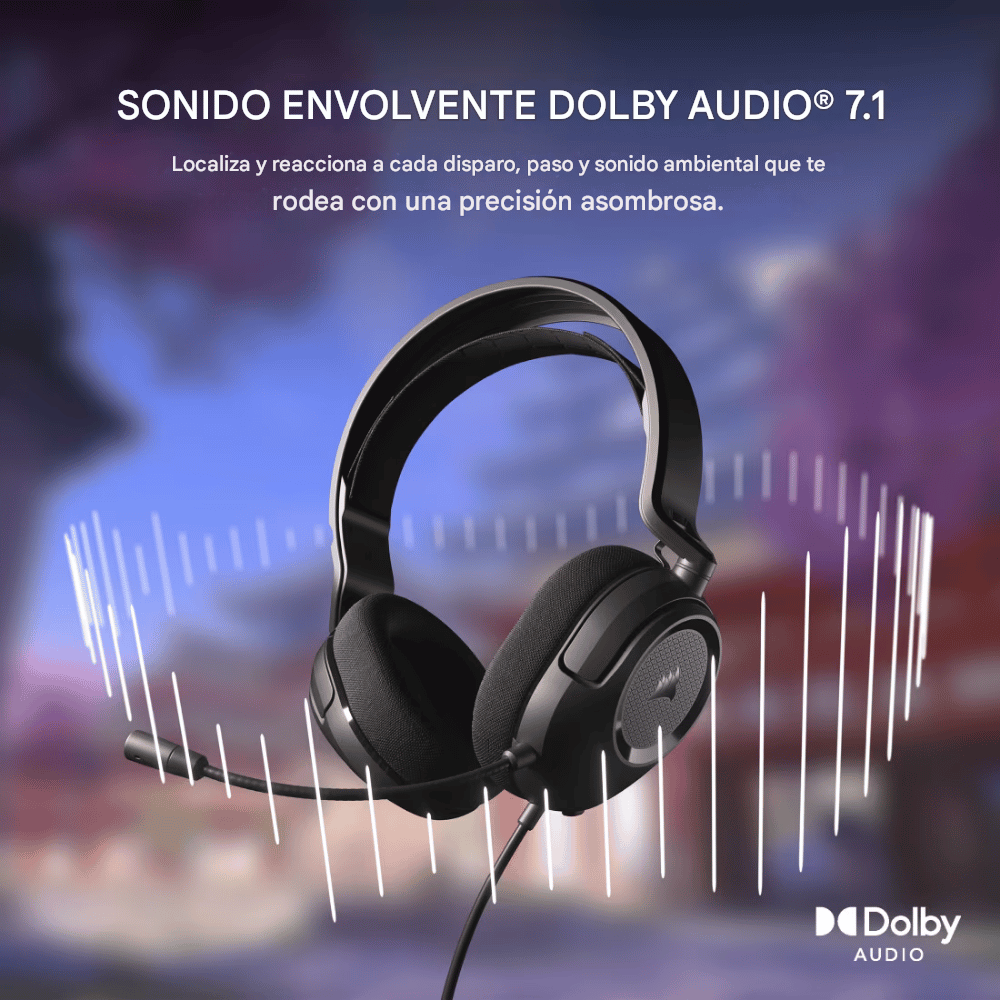 Incluye adaptador USB para activar Dolby Audio Surround 7.1 en PC y Mac, permitiendo localizar con precisión disparos, pasos y efectos para una experiencia de juego totalmente inmersiva.