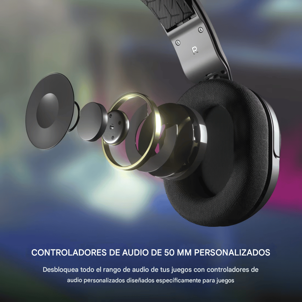 Los drivers de 50 mm ofrecen un audio potente y equilibrado, con graves profundos, medios claros y agudos definidos que sumergen al jugador dentro de la acción.