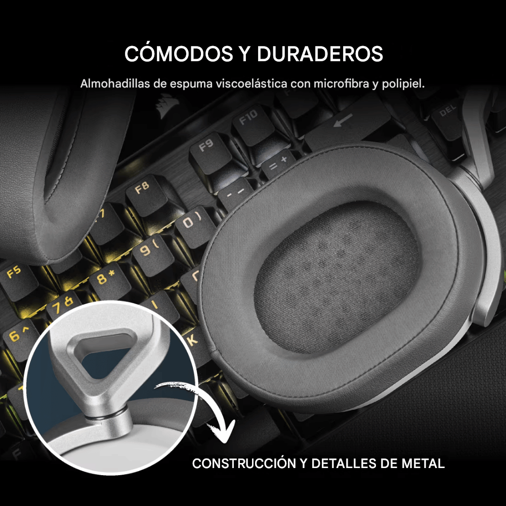 Cuenta con almohadillas de espuma viscoelástica con revestimiento en polipiel, diadema ajustable con microfibra transpirable y una estructura ligera reforzada con aluminio para jugar durante horas sin fatiga.