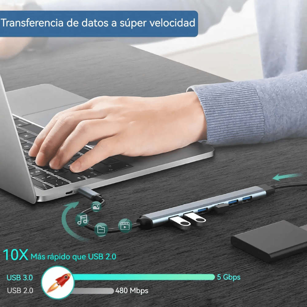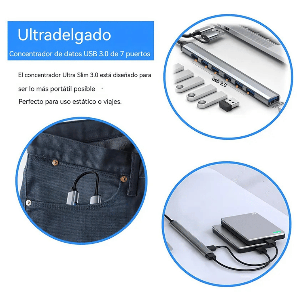 Permite transformar un solo puerto en siete puertos USB adicionales, solucionando de forma inmediata la falta de entradas disponibles en laptops, tablets y equipos compactos.