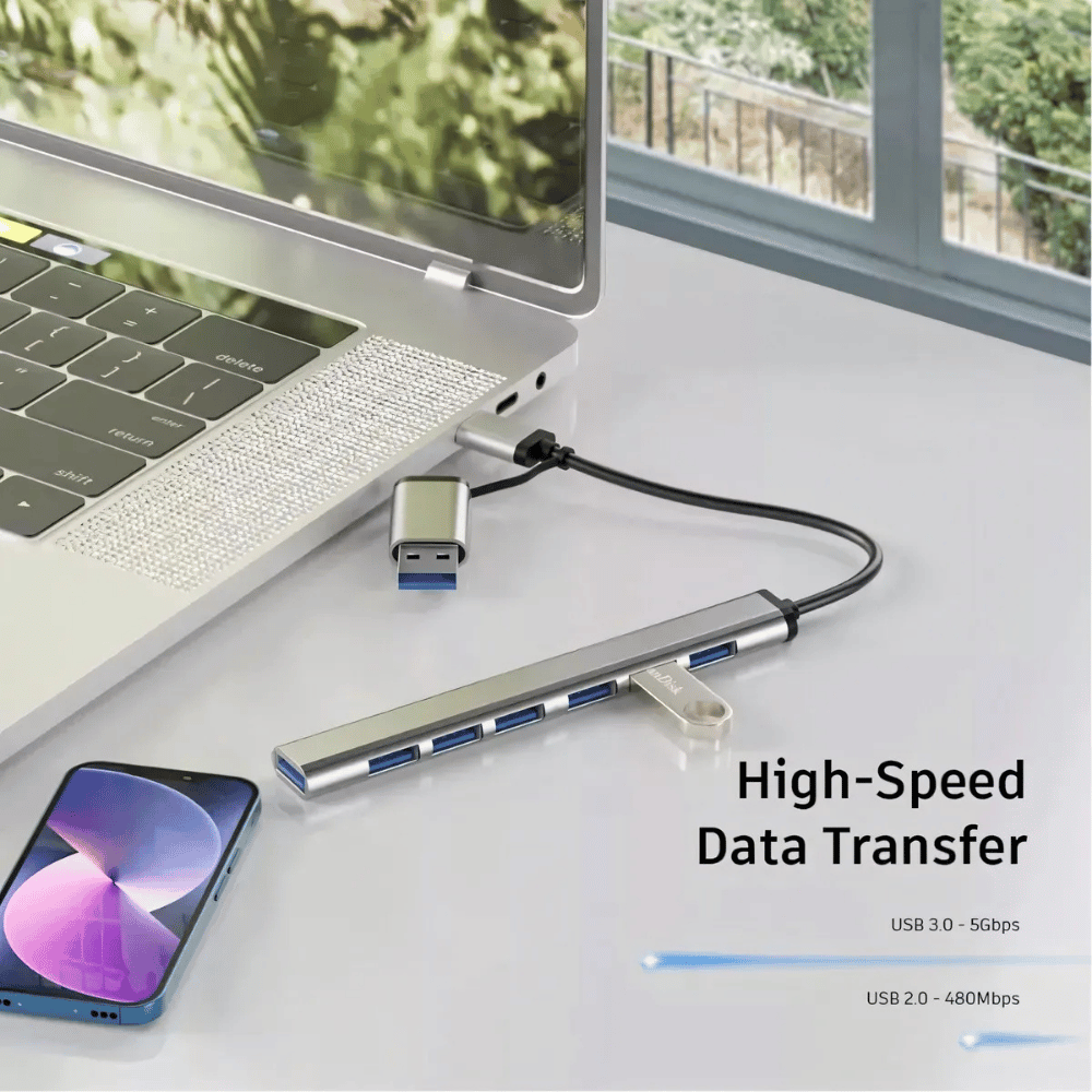 Multiplicador de puertos diseñado para ampliar fácilmente la conectividad de laptops y dispositivos modernos. Convierte un solo puerto en múltiples entradas USB, permitiendo trabajar, estudiar o entretenerse con mayor comodidad y sin limitaciones.