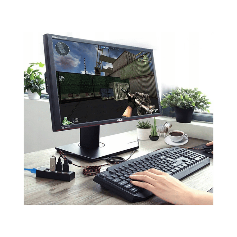Su diseño compacto combinado con un cable de 40 cm brinda mayor flexibilidad en la ubicación del HUB, adaptándose fácilmente a escritorios, oficinas o espacios de trabajo móviles.