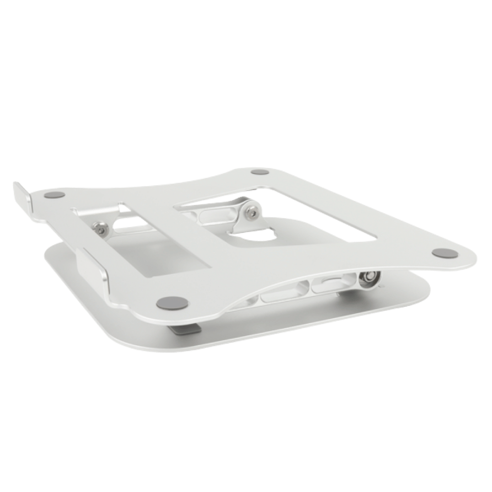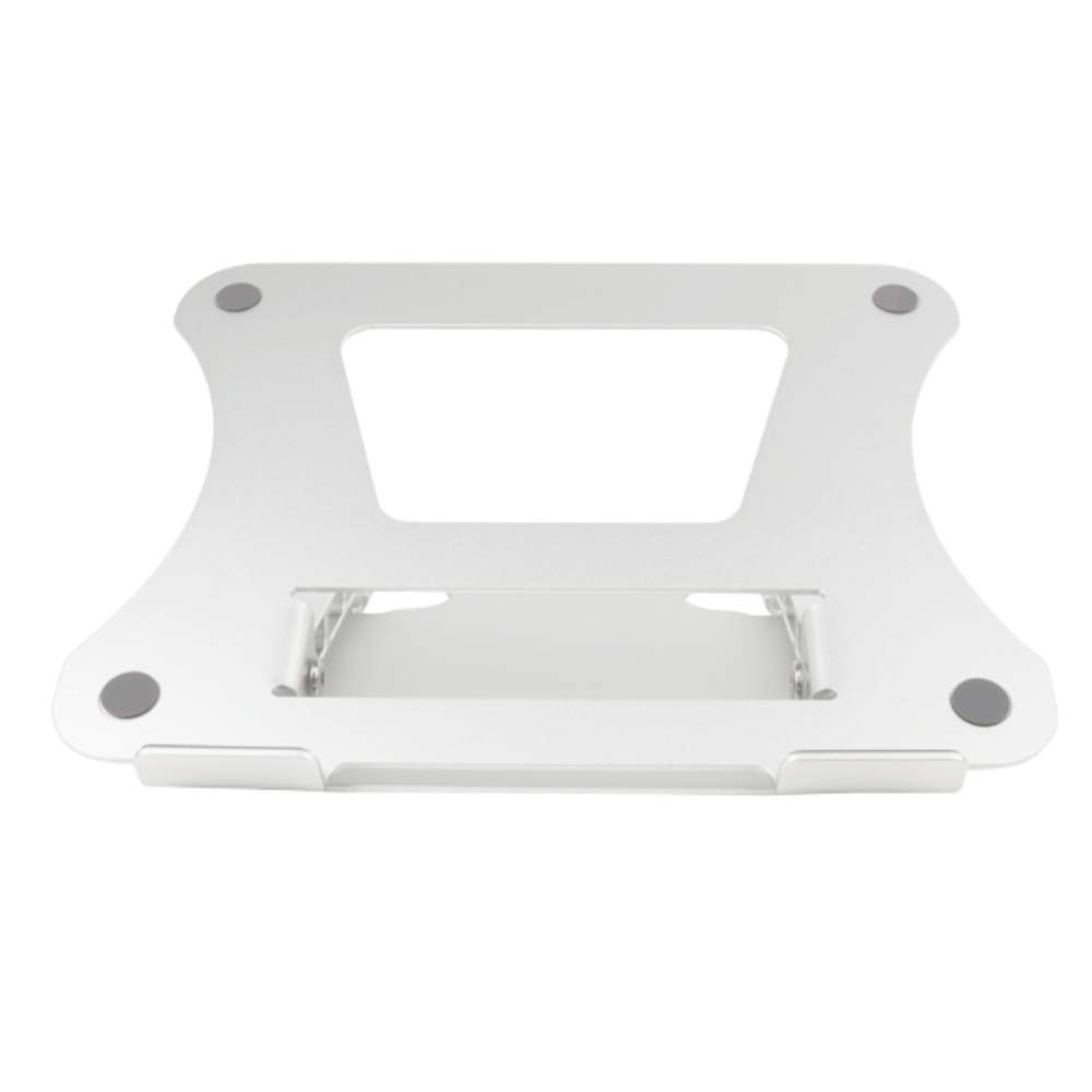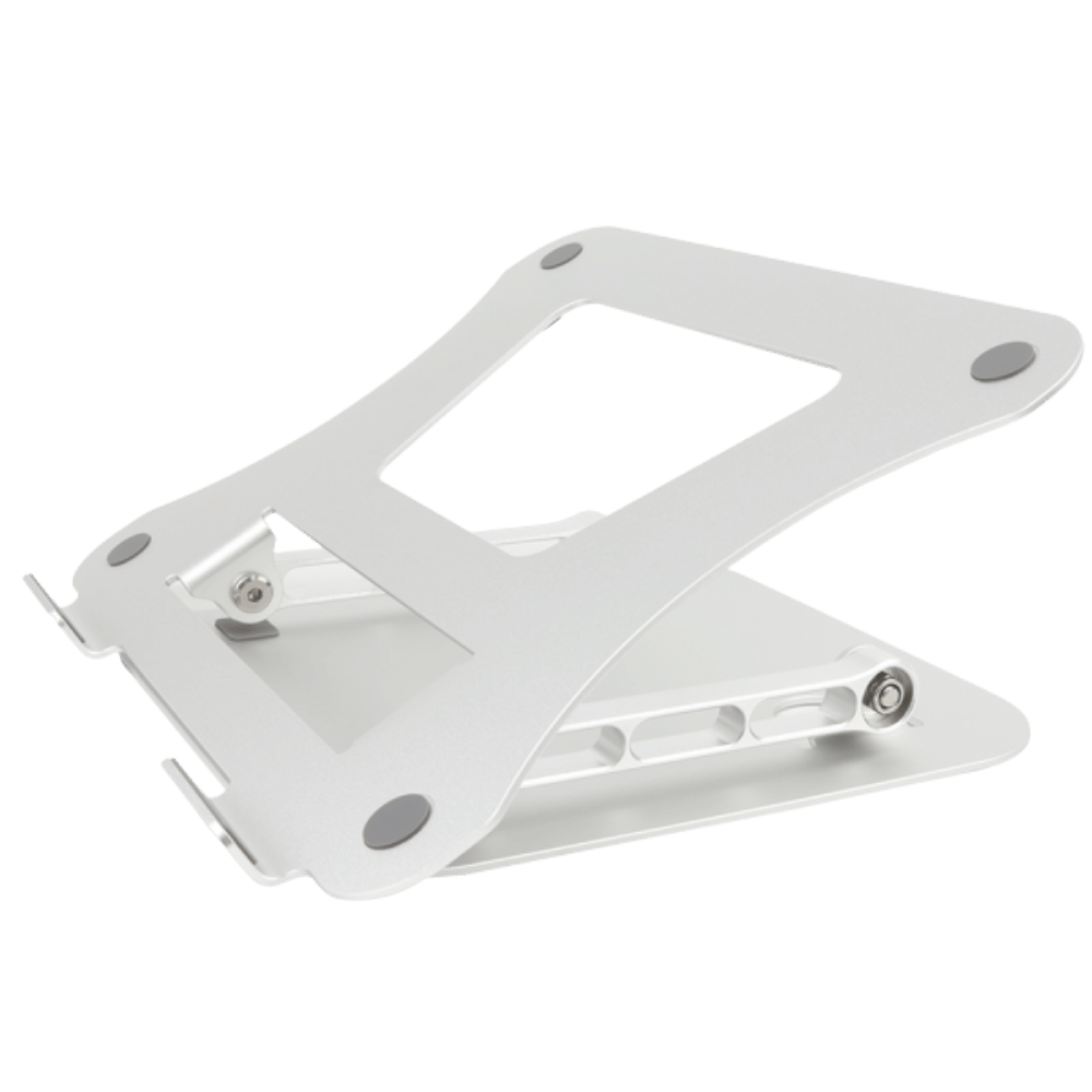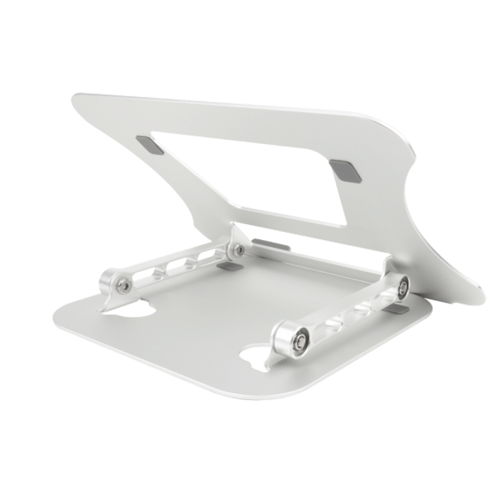 Soporte de aluminio multiángulo para portátiles hasta 17”. Ajustable, ergonómico y con espacio para teclado. Ideal para trabajar con estilo y confort.