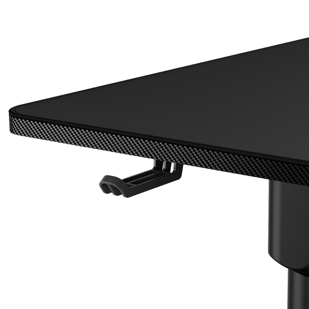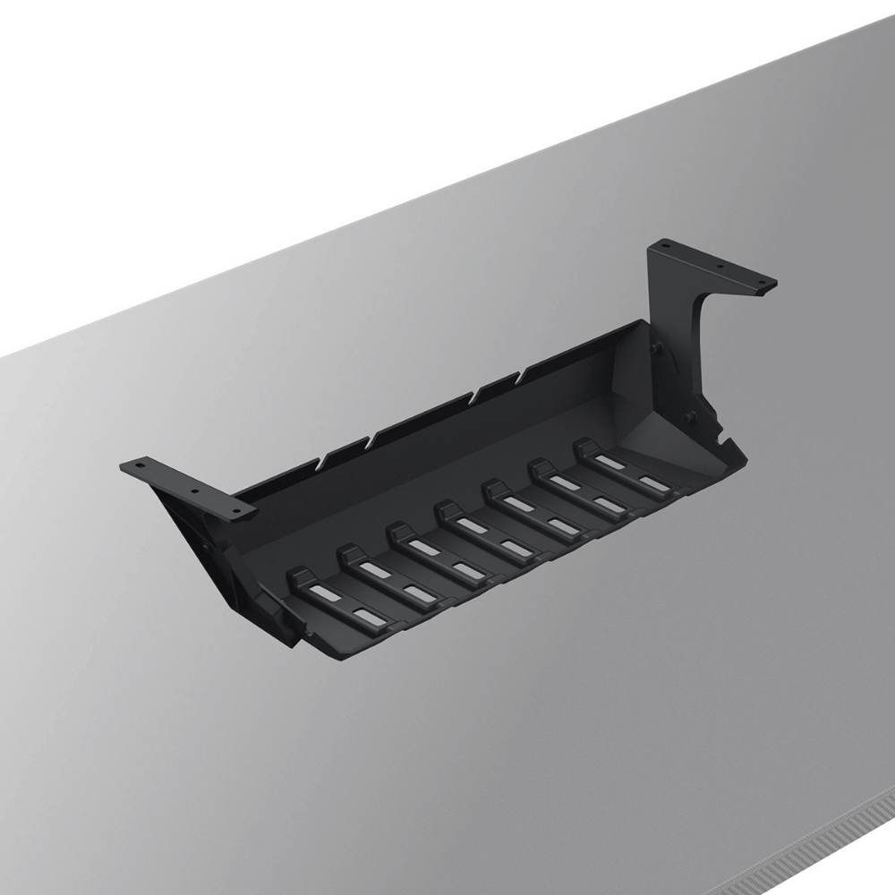 Incluye bandeja para administración de cables y soporte para auriculares, manteniendo la superficie completamente despejada y el espacio visual más limpio y eficiente.