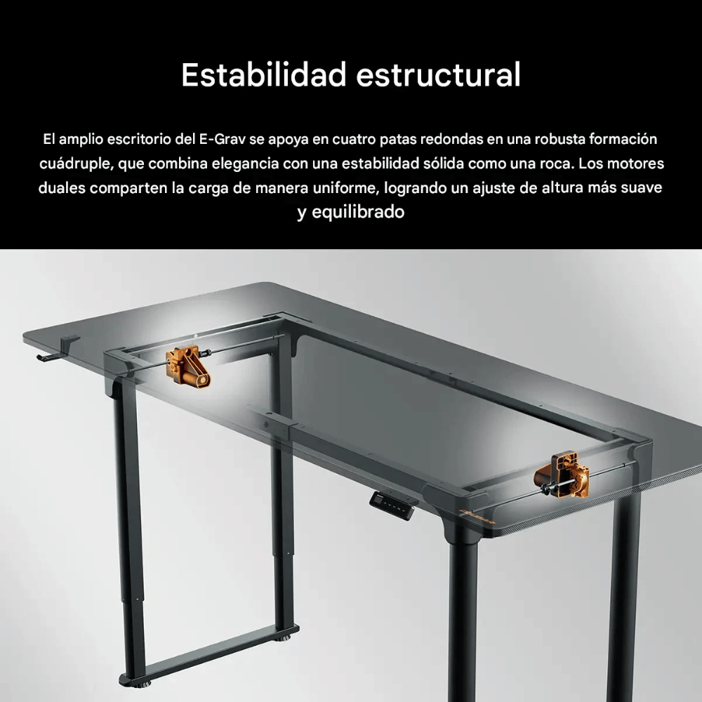 Las patas redondas en formación cuádruple y los dos motores distribuyen la carga uniformemente, ofreciendo movimientos más suaves y mayor firmeza incluso con el escritorio completamente equipado.