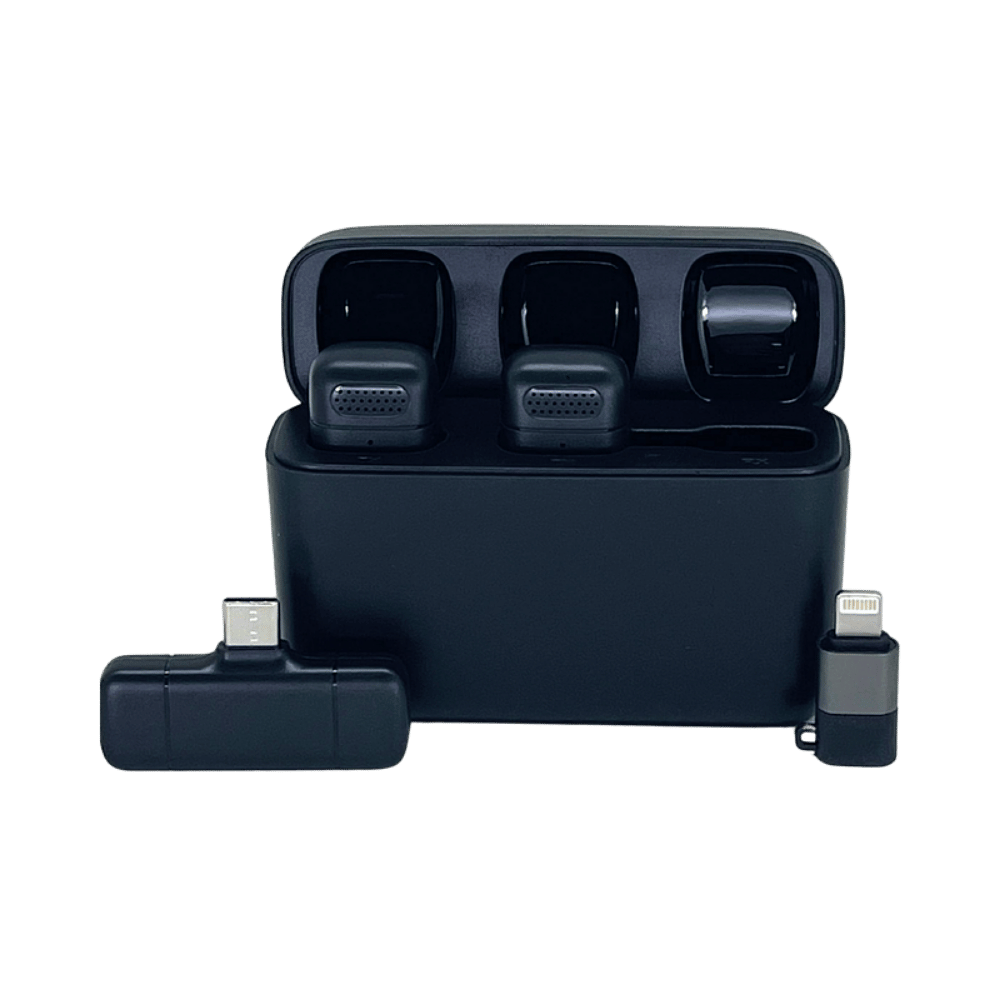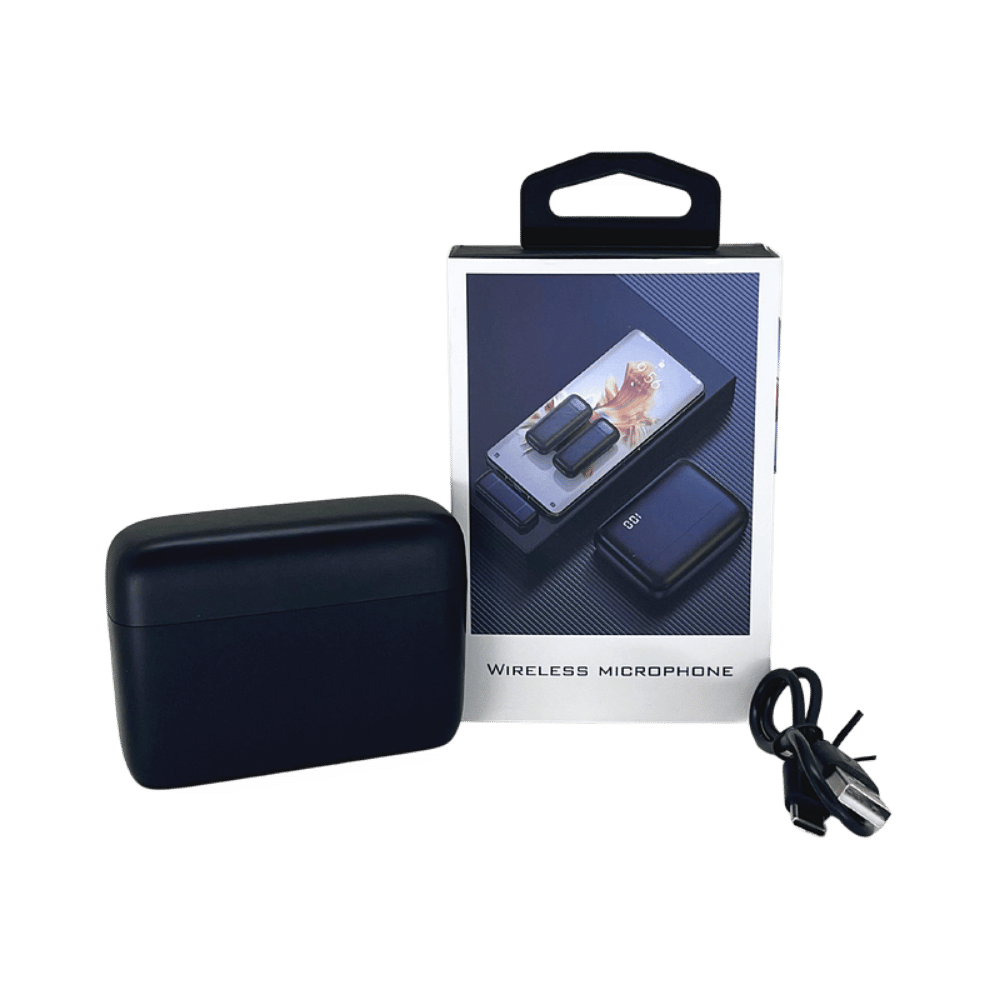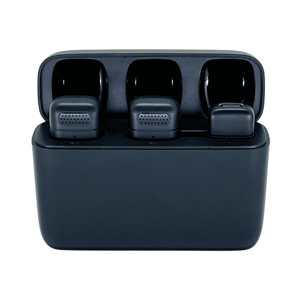 El case portátil permite recargar los micrófonos fácilmente, brindando entre 4 y 5 horas de grabación por ciclo, ideal para sesiones largas, entrevistas o creación de contenido durante el día.