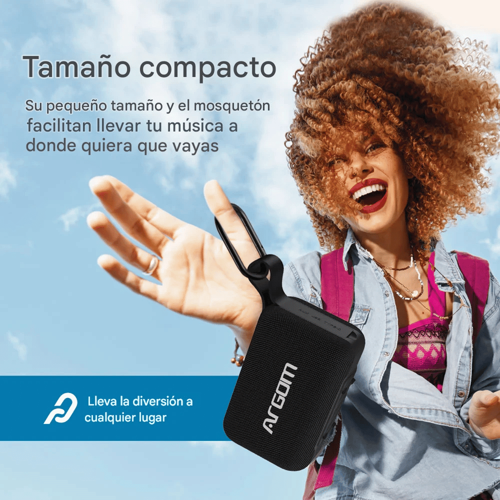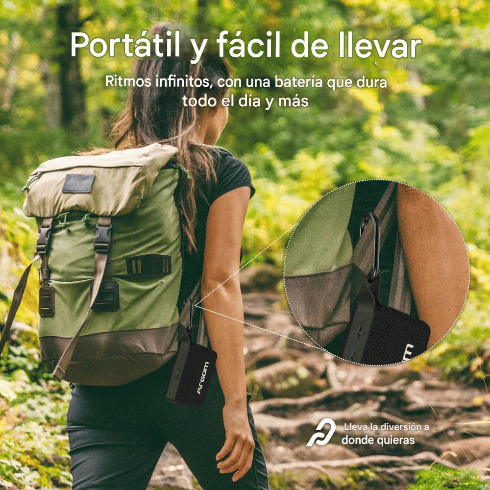 Incluye un mosquetón resistente, ideal para enganchar el parlante a mochilas, bicicletas o equipos de camping.