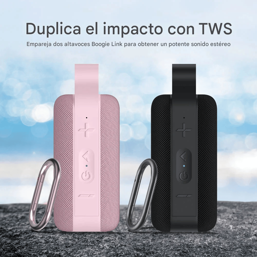 Disfruta tu música en cualquier lugar con el parlante inalámbrico BoogieLink, equipado con 8W de potencia, resistencia al agua IPX5 y hasta 24 horas de reproducción, ideal para aventuras al aire libre.
