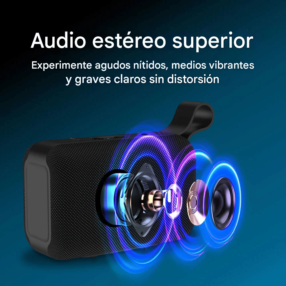 Este parlante portátil ofrece 8 vatios de potencia RMS, proporcionando un sonido claro, dinámico y con graves bien definidos.