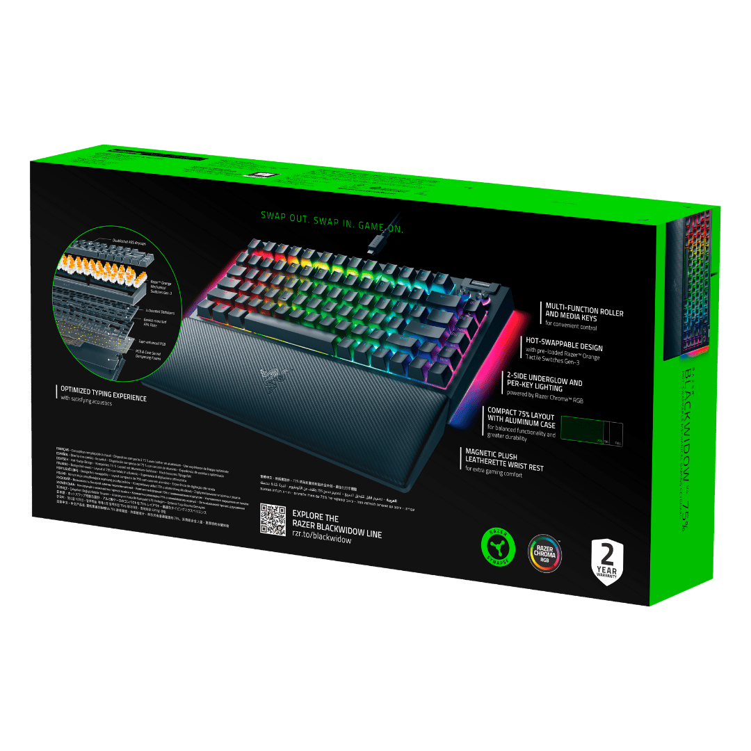 El BlackWidow V4 75% permite reemplazar fácilmente los switches instalados por cualquier opción compatible, dándote libertad total para personalizar el tacto, sonido y rendimiento del teclado sin necesidad de soldar. Ideal para entusiastas del modding y jugadores que buscan una experiencia a medida.