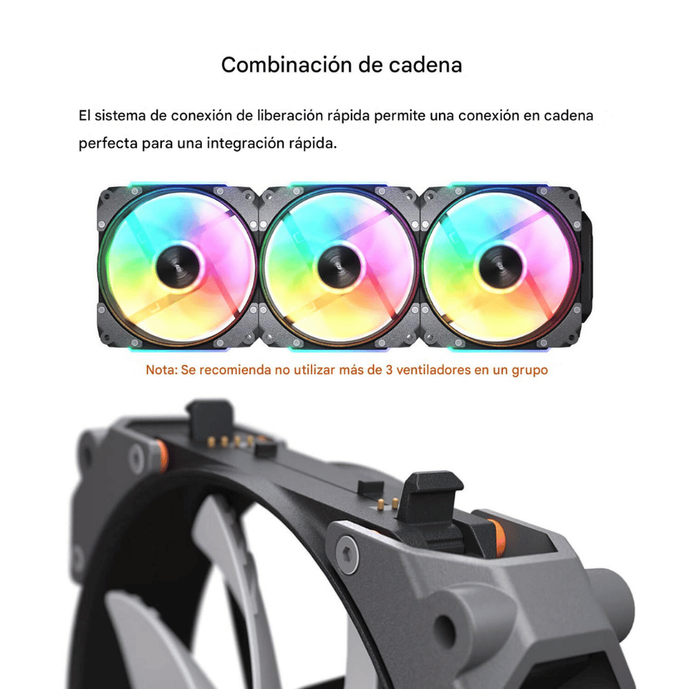 Ventiladores ARGB de alto rendimiento con aspas invertidas, amortiguación de vibración y conexión modular sin herramientas para un montaje más limpio y eficiente.